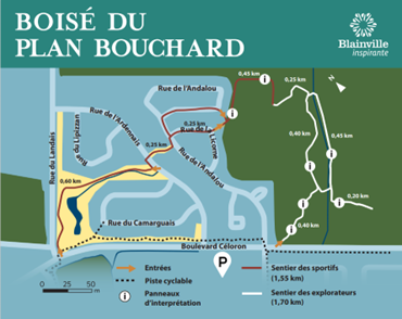 Le circuit de 3,25 km, aménagé en partie sur des passerelles au sein d’un riche milieu naturel, permet d’en apprendre davantage sur l’histoire de ce site qui fut à l’origine de la création de Blainville. Ce boisé, d’une superficie de près de 40 hectares et en grande partie marécageux, présente une flore et une faune diversifiées ainsi que des vestiges de ce qui fut, durant la Seconde Guerre mondiale, une usine de remplissage de munitions. Laissez-vous emporter dans une marche nordique à travers les époques!